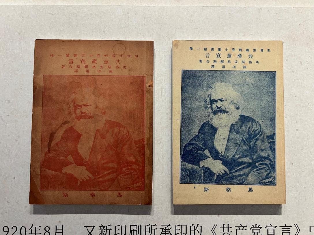 1920年8月,又新印刷所承印《共产党宣言》中文全译本初版1000册,封面上印有马克思半身坐像,水红底色。书名因排字工的疏忽被错印。9月,再印1000册,这次将封面底色换成了蓝色,书名更正为“共产党宣言”。